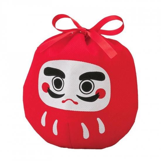 おめでたくてかわいい!不織布製のだるま巾着。お菓子が3個入っています。