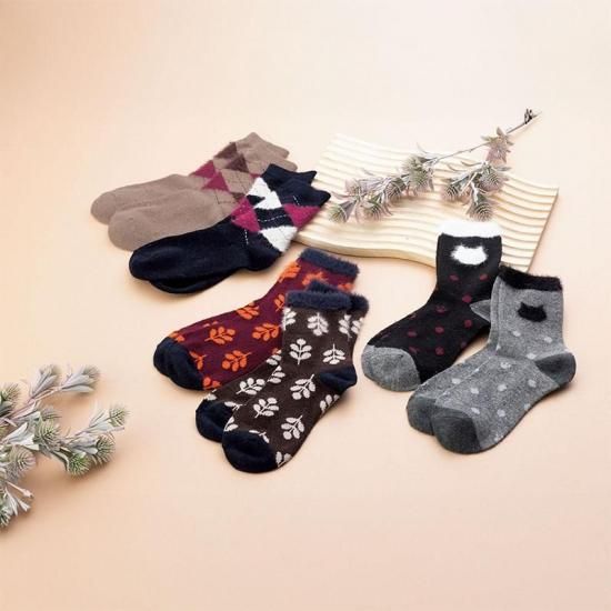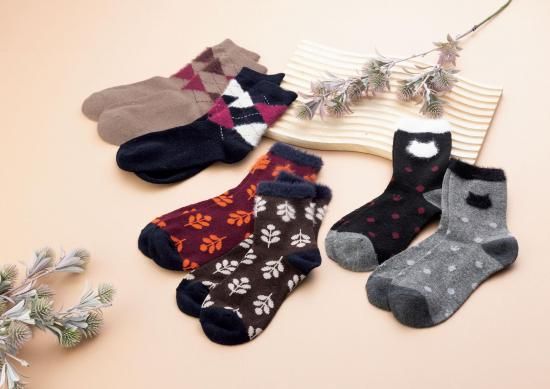 ふわふわファーがアクセント。落ち着いた色柄で使いやすい、あたたかいソックスです。