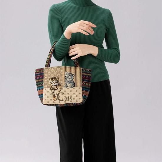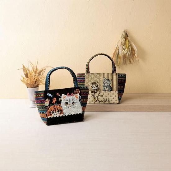 かわいいネコ柄の高級感あるゴブラン織り。マチが広く収納力もあるトートバッグです。