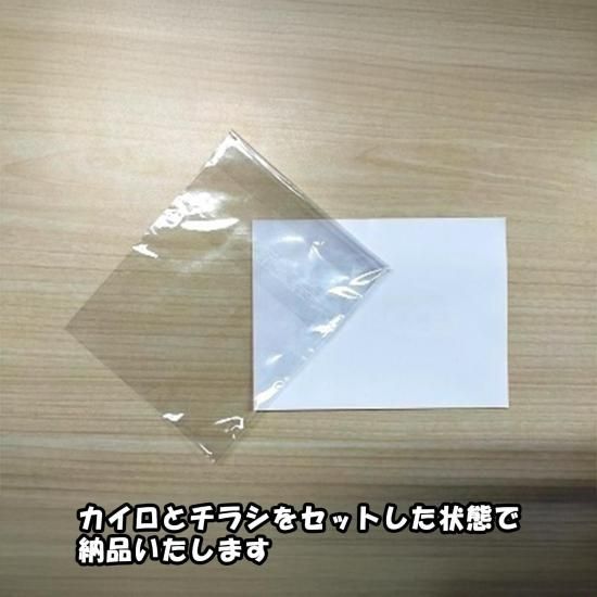 フルカラー印刷でチラシにできますのでこだわりのチラシを作ってみてはいかがですか?チラシはカイロの透明袋と同じサイズで印刷し、透明袋に封入した状態で納品します。