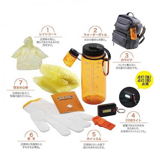 【セット内容】ウォーターボトル・カラビナ・防災の心得・レインコート・軍手(片方)・COBライト・ホイッスル×各1