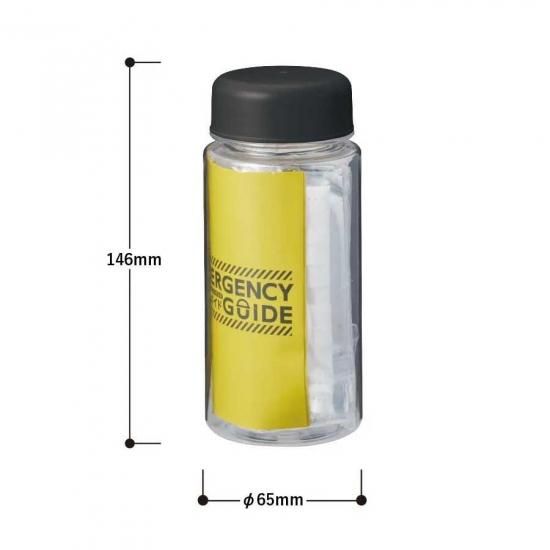 本体サイズ ボトル/Φ65×146(mm)・ホイッスル/28×71×7(mm)、ひも全長/約80(mm)・アルミブランケット/1400×700(mm)・圧縮タオル/広げた時:約200×220(mm) ・マスク/約165×95(mm)・防災ガイド/70×105(mm)