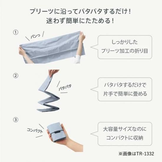 プリーツ加工されている生地を使用しているのでプリーツに沿ってパタパタするだけで簡単に畳めてコンパクトに持ち歩けます。